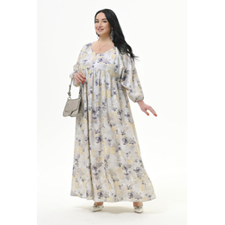 Платье длинное с V - вырезом, с кулисой под линией груди, штапель, принт "цветочная дымка"