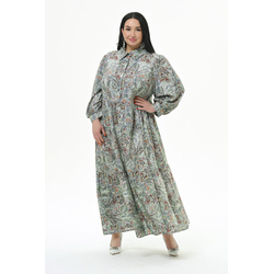 Платье длинное с V - вырезом и воланом по низу, штапель принт "зеленая абстракция"