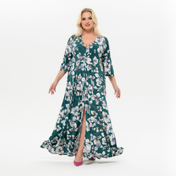 Платье длинное, с разрезом спереди, изумрудное, принт цветочный