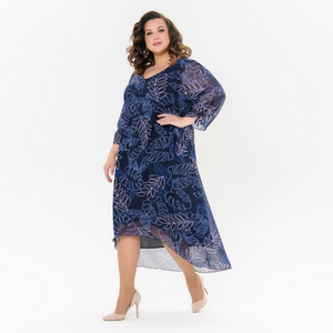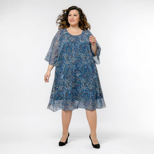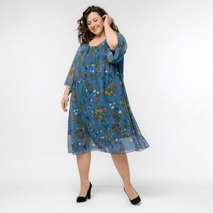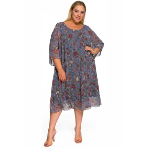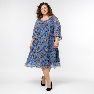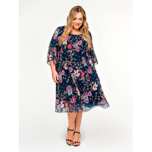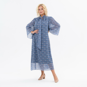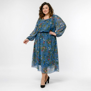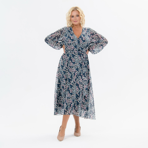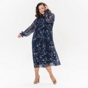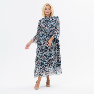 Платье А-силуэта, миди, шифон темно-синий с васильковыми цветами