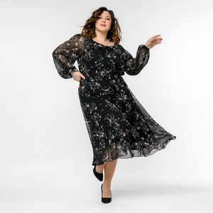 Платье А-силуэта, миди, шифон черный с пудровыми цветами