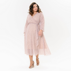 Платье шифоновое, лиф с запАхом, пудровое в черный горошек