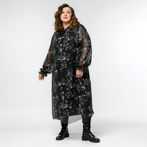 Платье из шифона с воротником "стоечка", черное, принт"веточки"
