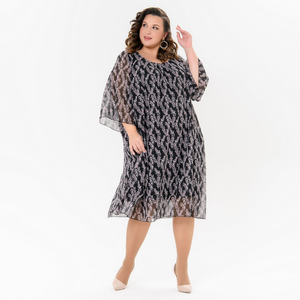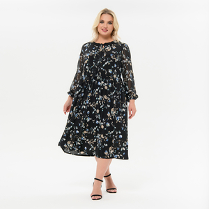 Платье силуэта трапеция, шифон черный, принт "веточки"