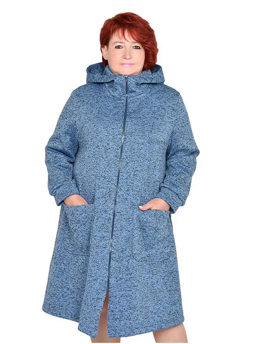 Пальто без подкладки из вязанного трикотажного полотна с ворсованной изнаночной стороной, с капюшоном, на молнии. 100% полиэстер.
