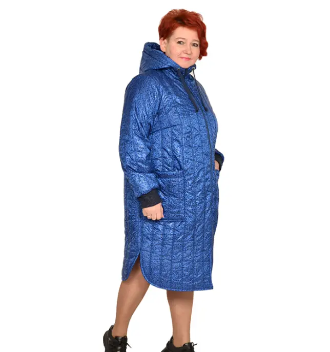 Пальто плащевое стеганое с карманами, на молнии, с воротником, с фигурными разрезами по боковому шву. Рукава на манжете.