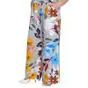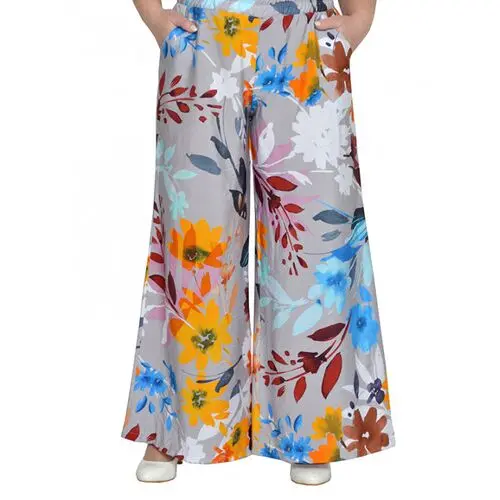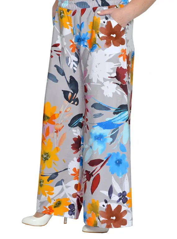 Брюки расклешенные, с карманами, пояс на широкой резинке. Ткань не тянется. Состав вискоза 65% и 35% пэ. Ткань имеет красивый, шелковистый, жатый эффект, не мнется, очень легкая и воздушная.