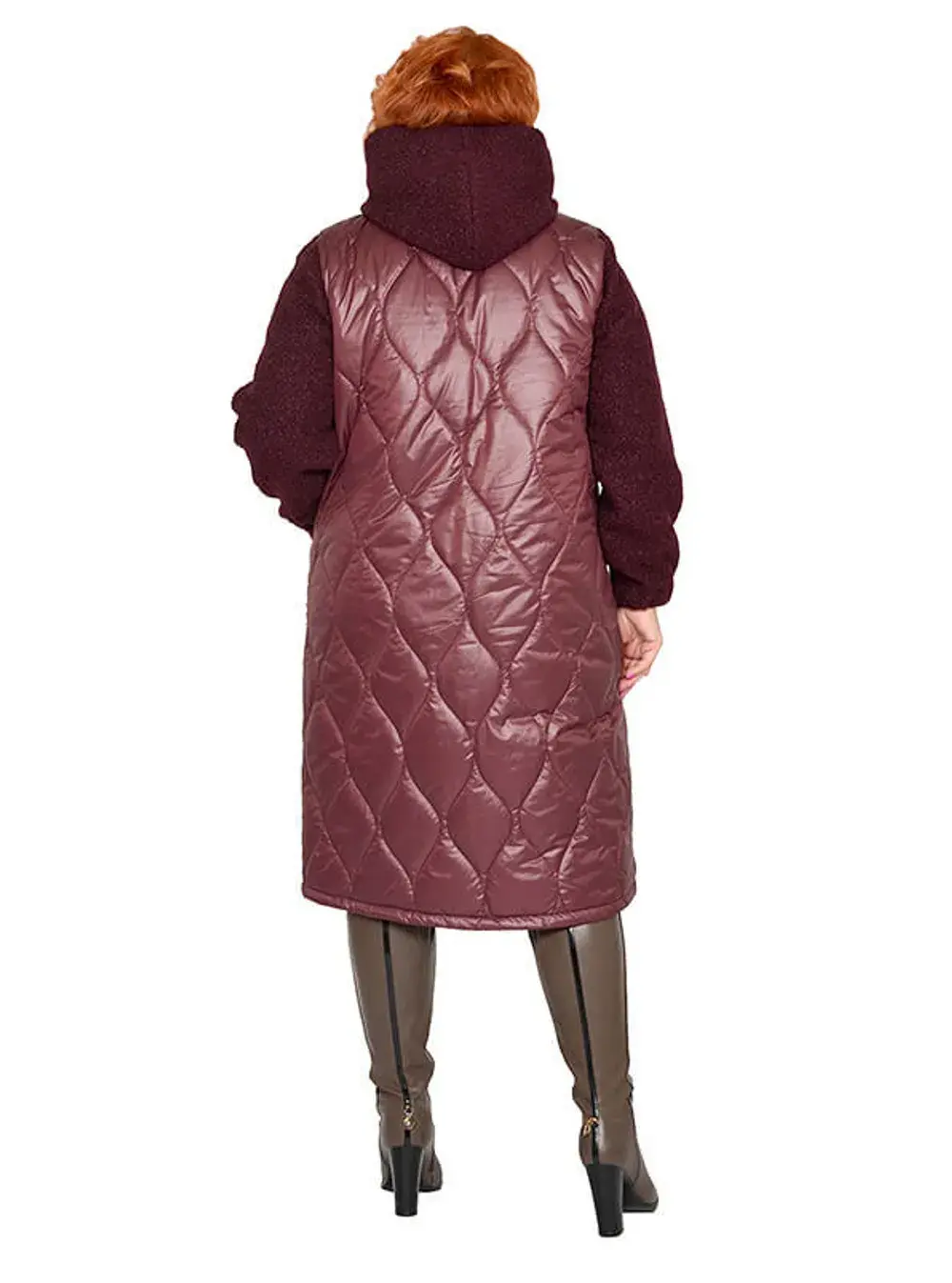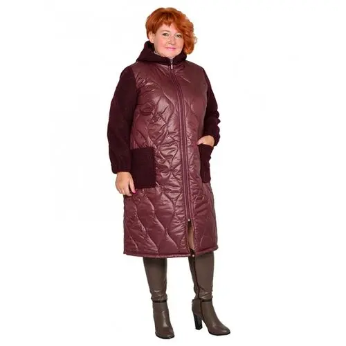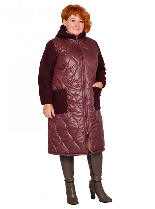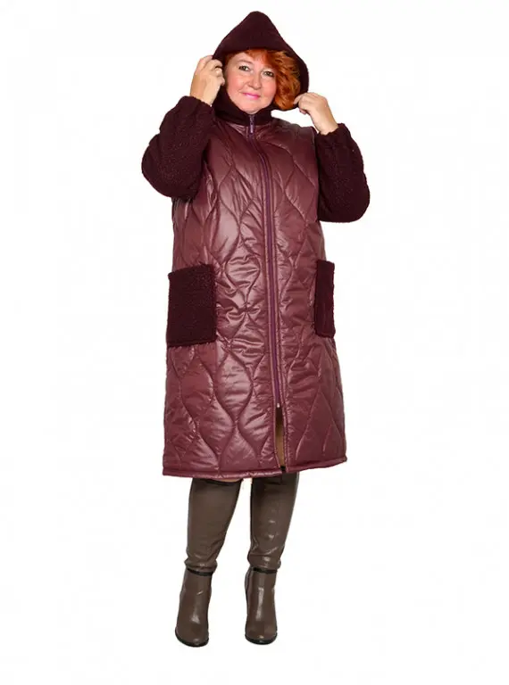 Пальто демисезонное с капюшоном, на молнии, с карманами. Перед и спинка из плащевки на синтепоне. Рукава, капюшон и карманы выполнены из пальтовой эластичной ткани барашек. Низ рукава на резинке. Хлопковая подкладка по переду и спинке. Длина 105-120 см.