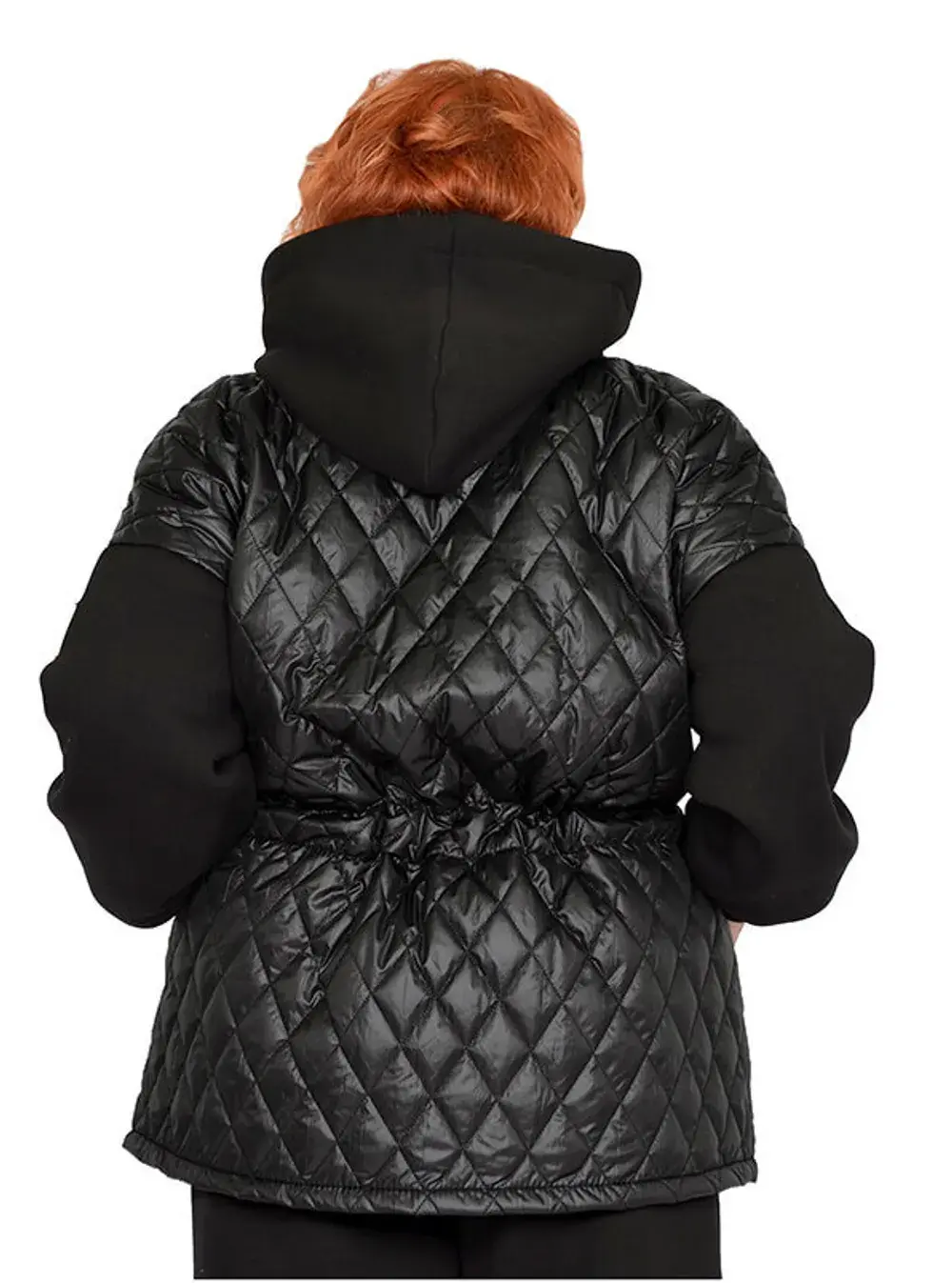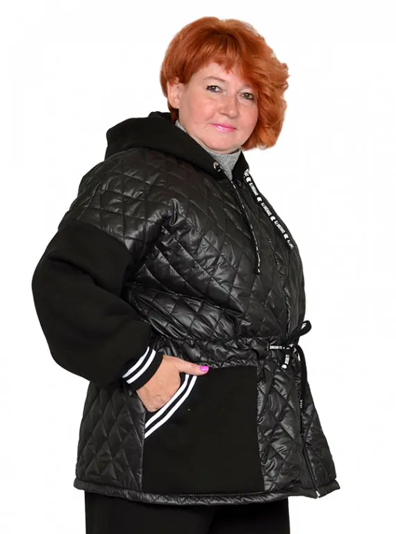 Куртка с капюшоном, на молнии, с карманами, на кулиске. Перед и спинка из плащевки на синтепоне. Рукава, капюшон и карманы выполнены из трикотажа трехнитка с начесом. Хлопковая подкладка по переду и спинке. Отделка по рукаву, карману декоративная резинка. На рукаве декоративный элемент.
