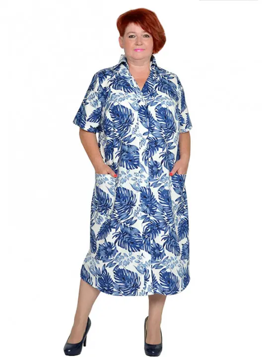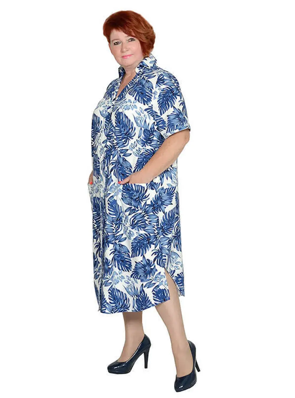 Платье-рубашка с застежкой на кнопки, с карманами и разрезами по бокам. Ткань лен 35% и 65% пэ.