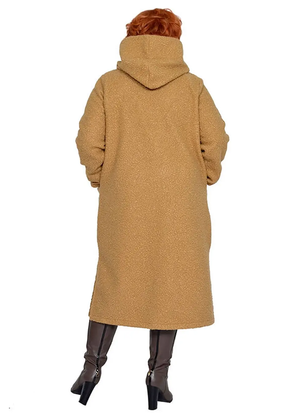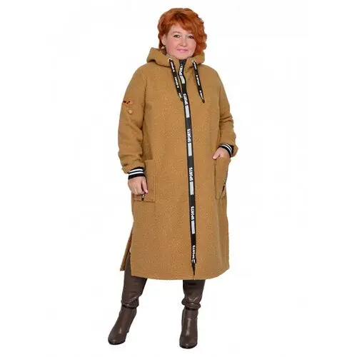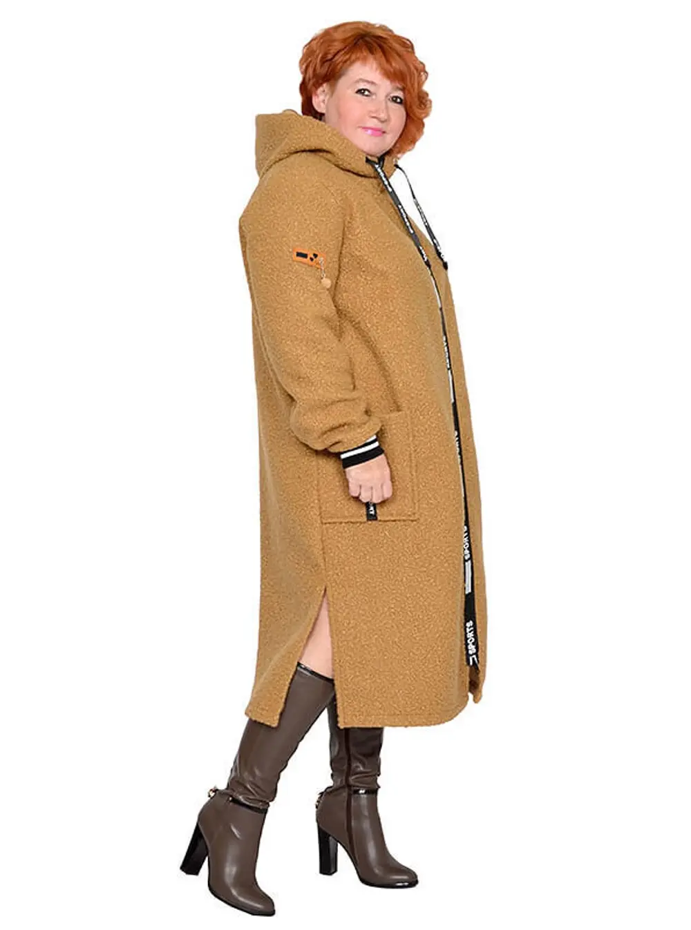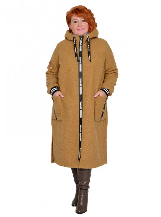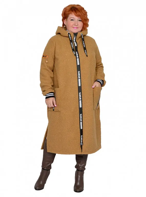Пальто в стиле спорт из пальтовой ткани «барашек». Состав 100% пэ. Ткань очень теплая, не мнется, сезон осень-весна. Модель с декоративными элементами, с разрезами, застежка молния, с карманами, с капюшоном, без подкладки. Длина 110-120 см.