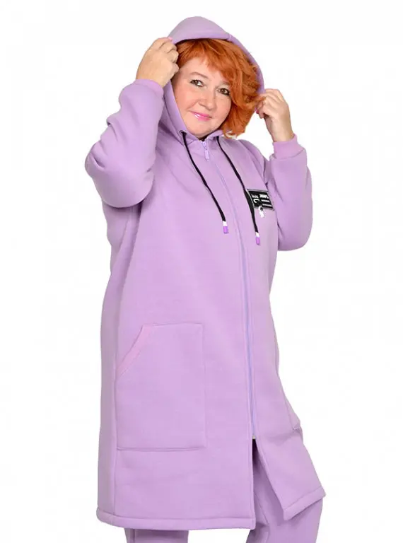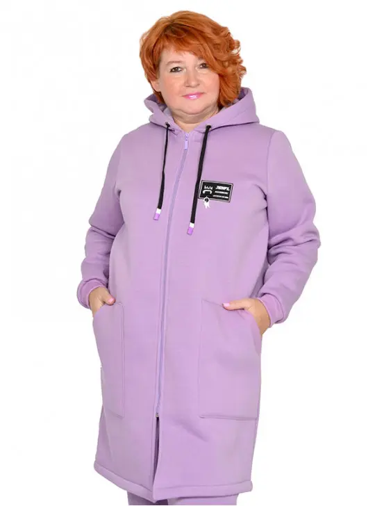 Толстовка удлиненная из трикотажного полотна футер 3х нитка. Состав 60% хлопок,35% пэ,5% эластан. Лицевая сторона гладкая, изнанка с начесом. Ткань очень теплая. Модель с карманами, с декоративным элементом, застежка молния.