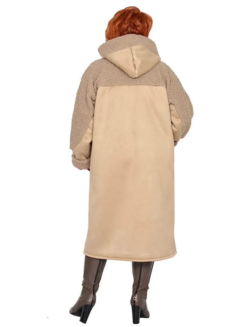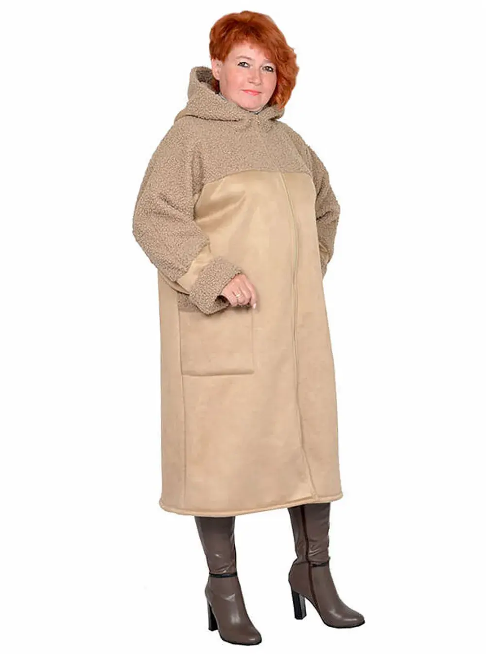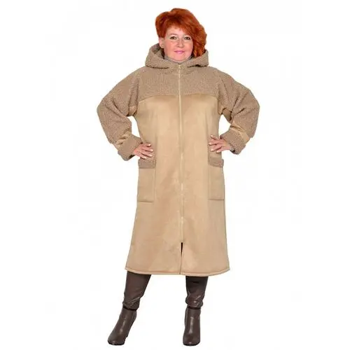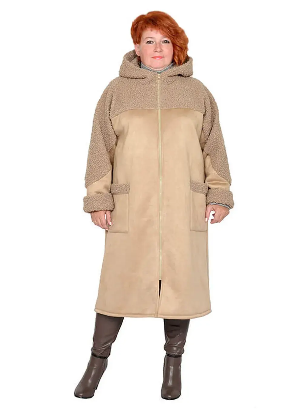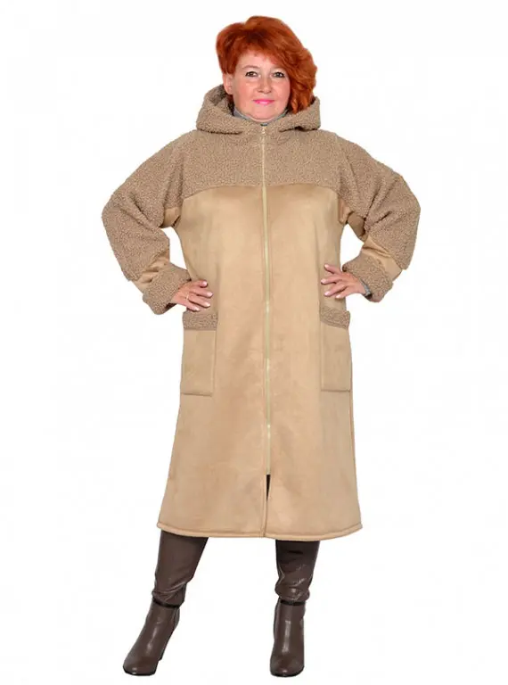 Пальто-дубленка из искусственной двухсторонней замши. Состав 95% пэ и 5% эластан. Ткань не мнется, приятная к телу, немного тянется, очень теплая. Изнаночная сторона барашек, верх искусственная замша. Модель на молнии, с капюшоном, с карманами, без подкладки. Сезон евро-зима. Длина 105-120 см.