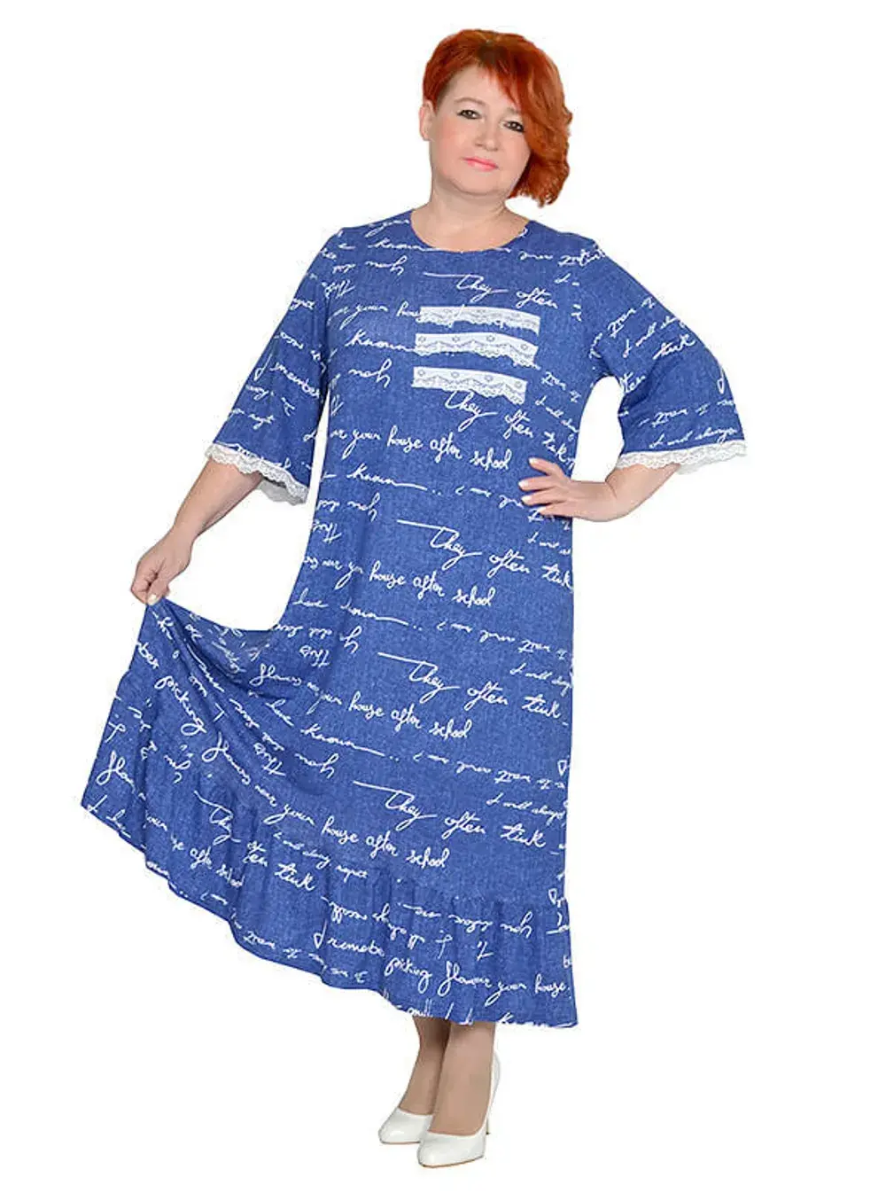 Платье из трикотажного полотна вискоза. По рукаву и спереди отделка трикотажным кружевом, по низу оборка.