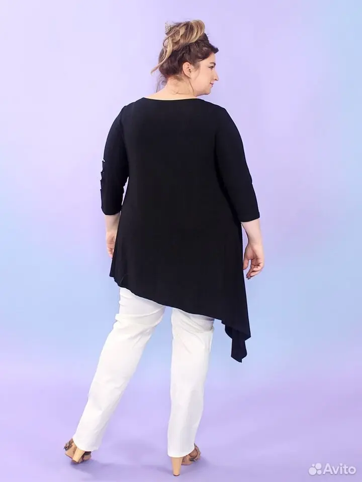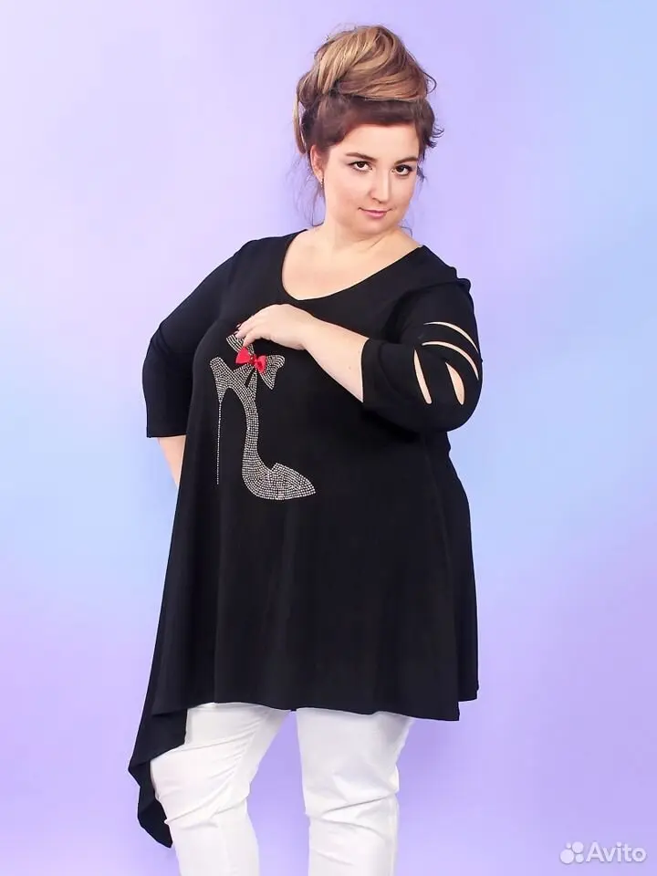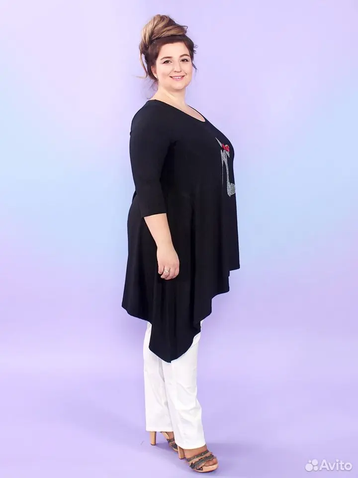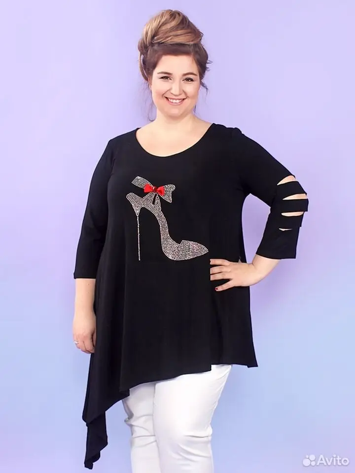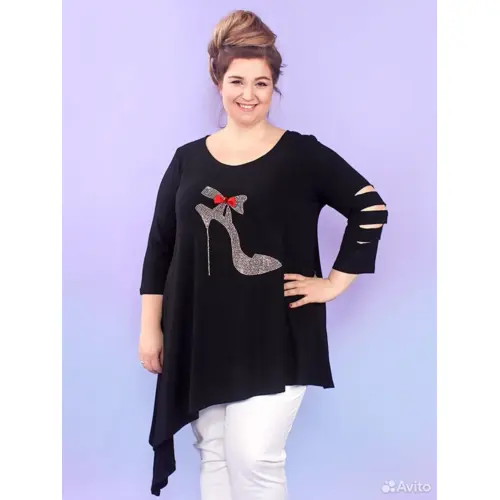 Туника с перепадом длины. На одном рукаве разрезы. Украшена туфелькой из страз, без красного бантика. Ткань вискозный трикотаж. Состав ткани 90% вискоза, 10% эластан. Длина 75/95 см.