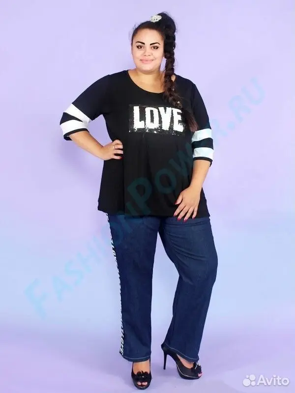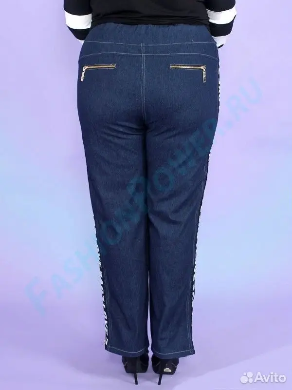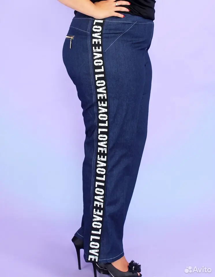 Стильные прямые джинсы коттон с высокой посадкой. По бокам проходят лампасы с надписью LOVE. Сзади пришиты молнии в виде карманов - обманки. Длина: 108 см. Состав ткани: 98% хлопок, 2% лайкра.