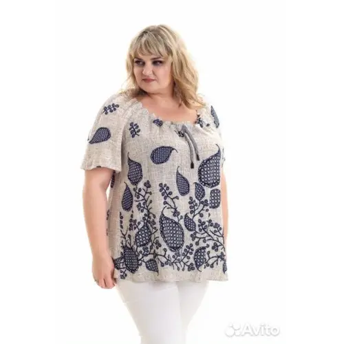 Ткань штапель, состав 50% хлопок, 50% вискоза. Легкая, летняя туника свободного силуэта. Рукав короткий . Изделие собрано у горловины на шнуровку. Ткань невесома и легка. Длина около 70 см.