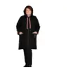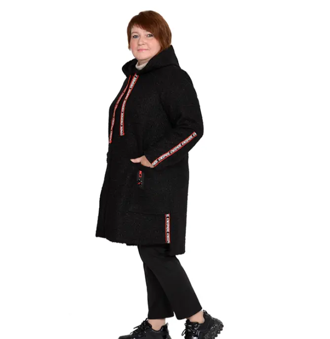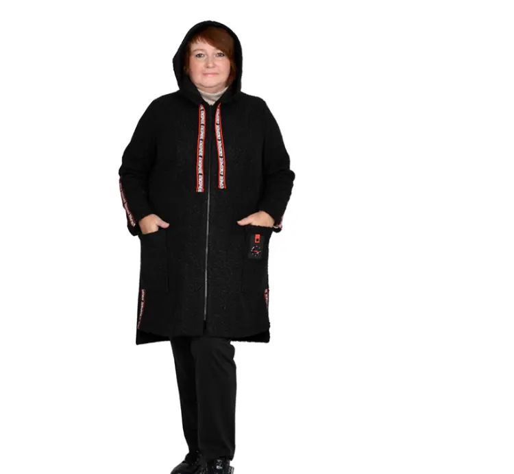 Куртка-Пальто. Модель с карманами, застежка молния, с капюшоном, без подкладки, на груди вытачки. Ткань -барашек, состав пэ, тянется умеренно, очень теплая и легкая, не мнется. С декоративной отделкой на кармане-компас и декоративной тесьмой по рукаву, боковому шву. Завязки у капюшона также декоративная тесьма. Спинка у модели чуть длиннее полочки. Сезон весна-осень.