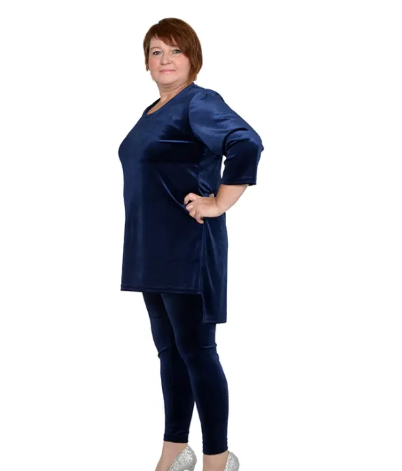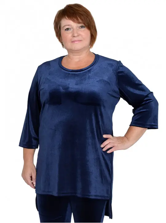Туника удлиненная сзади. Спинка длиннее переда на 10 см. Рукав втачной ¾. Ткань велюр, не мнется.