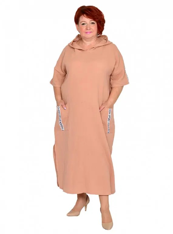 Платье с капюшоном, с карманами, с разрезами по боковому шву, с декоративной отделкой. Модель из ткани муслин, двухслойная марлевка. Состав хлопок 100%.