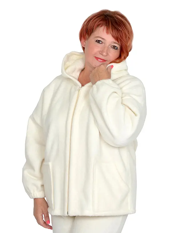 Толстовка из трикотажного полотна, с карманами, с капюшоном, на молнии. Ткань хорошо тянется, теплая, приятная к телу, не мнется, лицевая сторона валяная. Состав акрил 80%, эластан 5%, шерсть 15%. Длина 75-90 см.