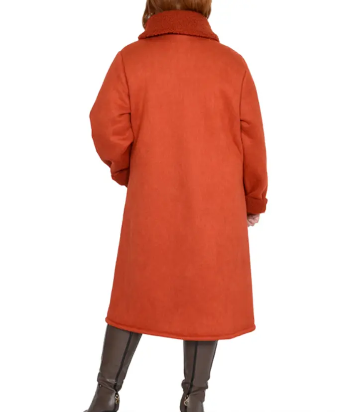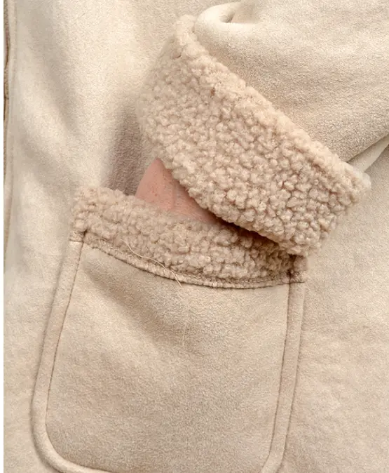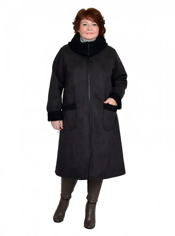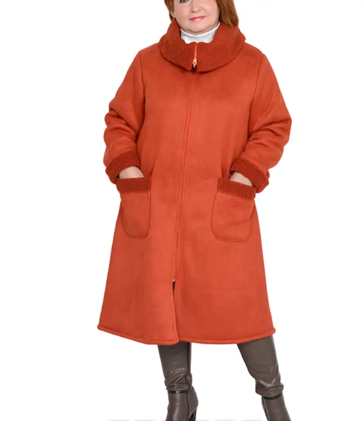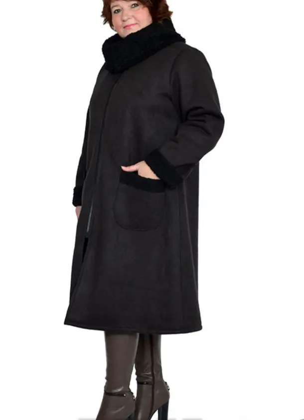 Дубленка из искусственной двухсторонней замши, с карманами , с большим отгибающимся воротником, застежка-молния. Ткань хорошо тянется, теплая. приятная к телу, не мнется.. Состав пэ 95% и эластан 5 %. Модель без подкладки на прохладную погоду., евро зима. Длина 105-115 см.