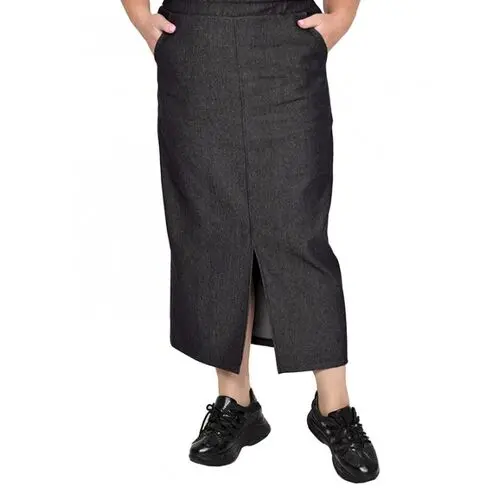 Юбка из плотной джинсовой ткани с разрезом по переду, с карманами. Состав 65%хлопок, 35% пэ. Пояс на широкой резинке.