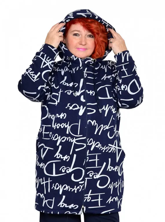 Толстовка из двухслойного трикотажного полотна. Состав 55% пэ, 5% эластан и 40% вискоза. Изнанка ворсованная, верхний слой гладкий трикотаж. Ткань теплая, не мнется, приятная к телу. Модель с карманами, на молнии, с капюшоном.