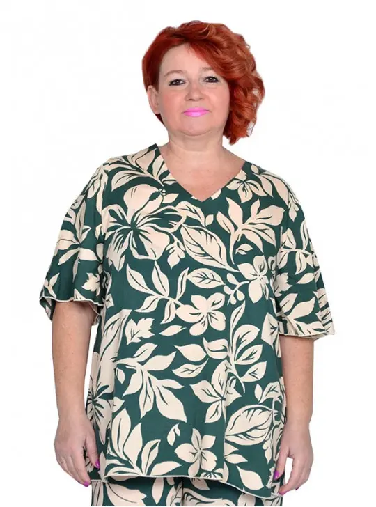 Туника с V образным вырезом зеленая принт размеры 50-84
