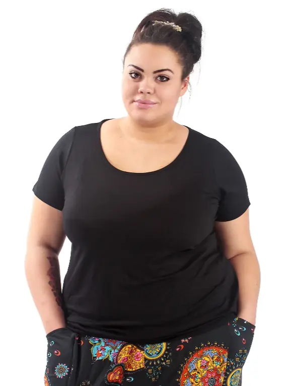 Футболка из вискозного трикотажа. Длина 68-72 см, состав ткани 95% вискоза, 5% эластан.