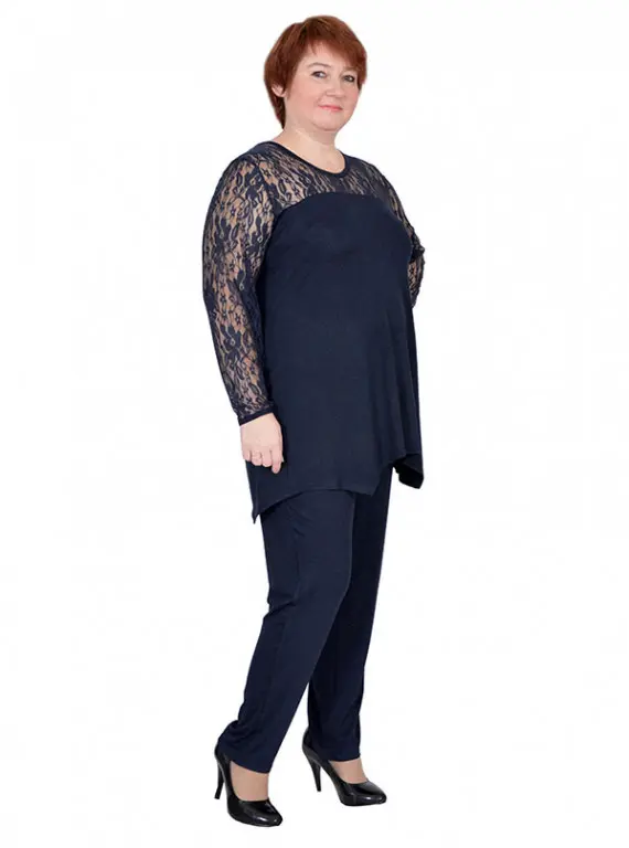 Туника из вискозного трикотажного полотна и стрейчевого кружева, из которого выполнены рукава, кокетки полочки и спинки. Фигурная линия низа.