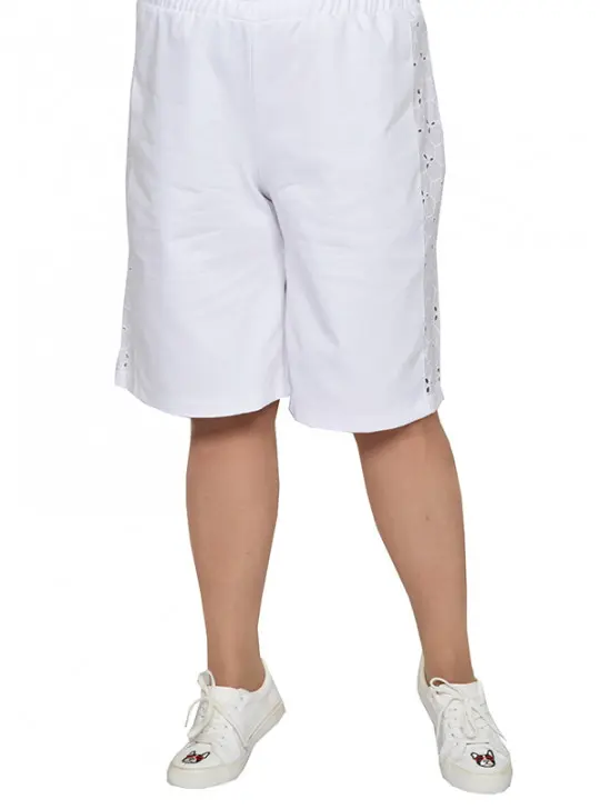 Шорты из джинсовой ткани со вставками по бокам из батистового шитья. Состав хлопок 95%, эластан 5%. Пояс на широкой резинке.