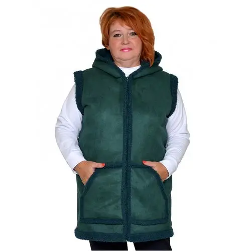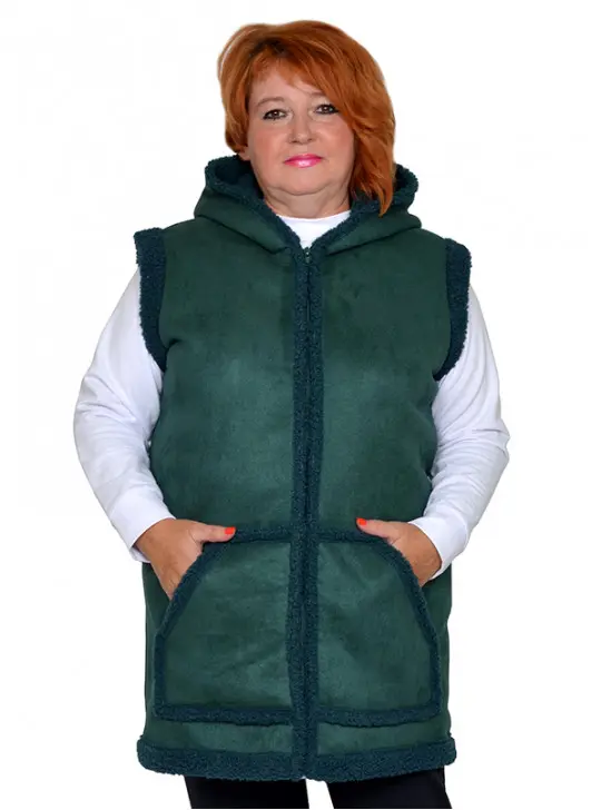 Жилет из искусственной двухсторонней замши, с карманами, с капюшоном, застежка молния. Ткань хорошо тянется, теплая, приятная к телу, мягкая. Состав пэ 95%, эластан 5%. Модель без подкладки, изнанка- барашек, лицевая сторона-искусственная замша. Длина 85-100 см.