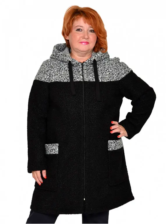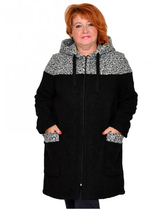 Куртка-пальто комбинированная из пальтовой ткани «барашек». Состав 100% пэ. Ткань немного тянется, не мнется, мягкая, теплая. Сезон осень-весна. Модель с капюшоном, на молнии, с карманами. Модель без подкладки. Длина 85-100 см..