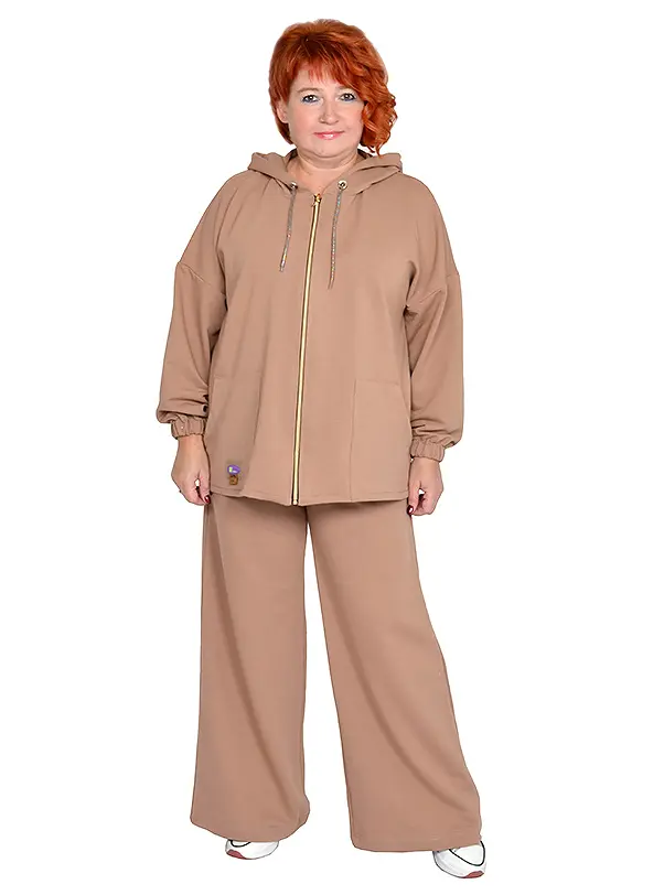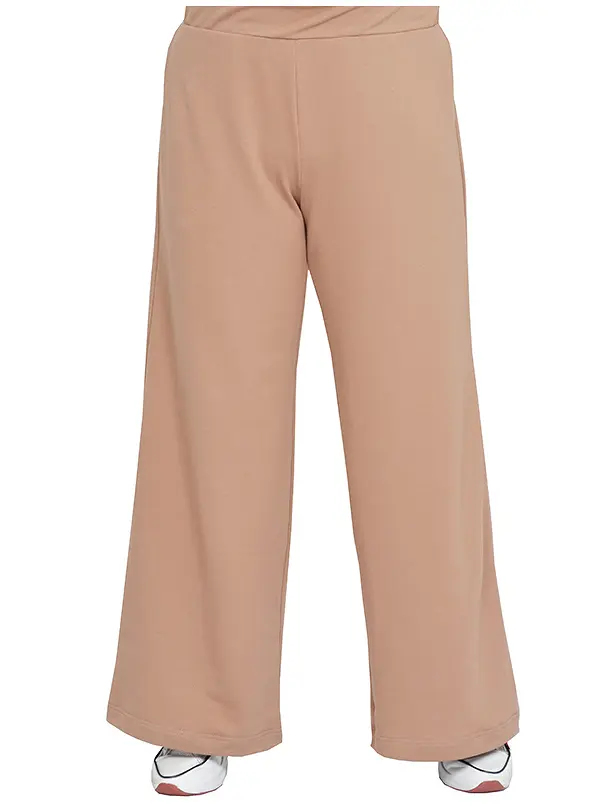 Брюки из плотного трикотажного полотна футер двух-нитка. Состав пэ 65%, хлопок 35% и 5% эластан. Брюки широкие, пояс на широкой резинке.