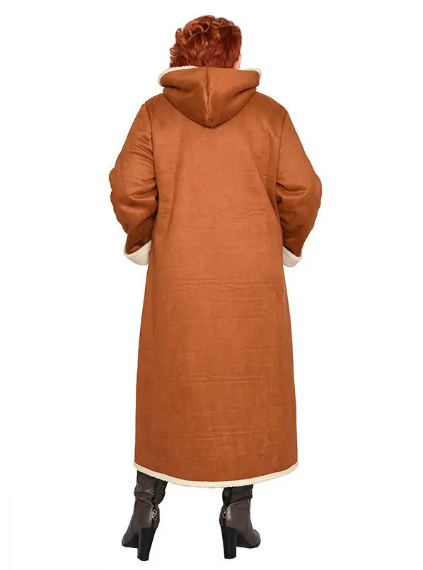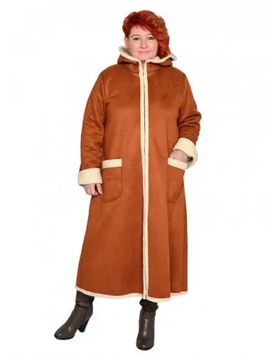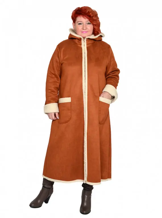 Дубленка-пальто из искусственной двухсторонней замши. Состав 5% эластан и 95 % пэ. Ткань мягкая, плотная, не мнется, очень теплая. Сезон осень-еврозима. Модель без подкладки, с карманами, с капюшоном, застежка молния. Длина 115-125 см.