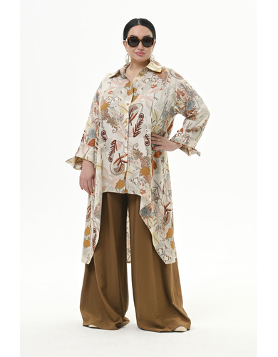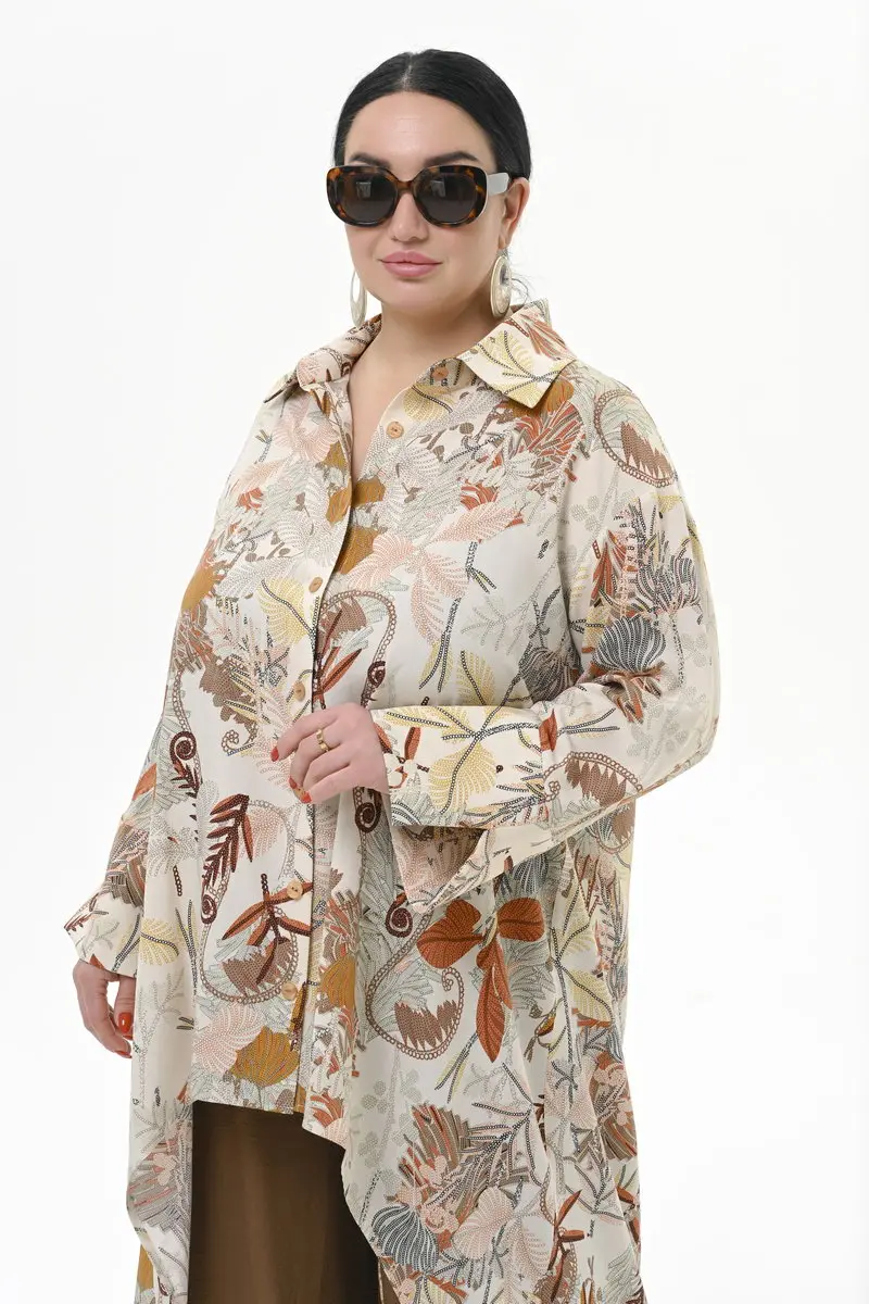 Рубашка с фигурной линией низа из вискозы, принт бежевый