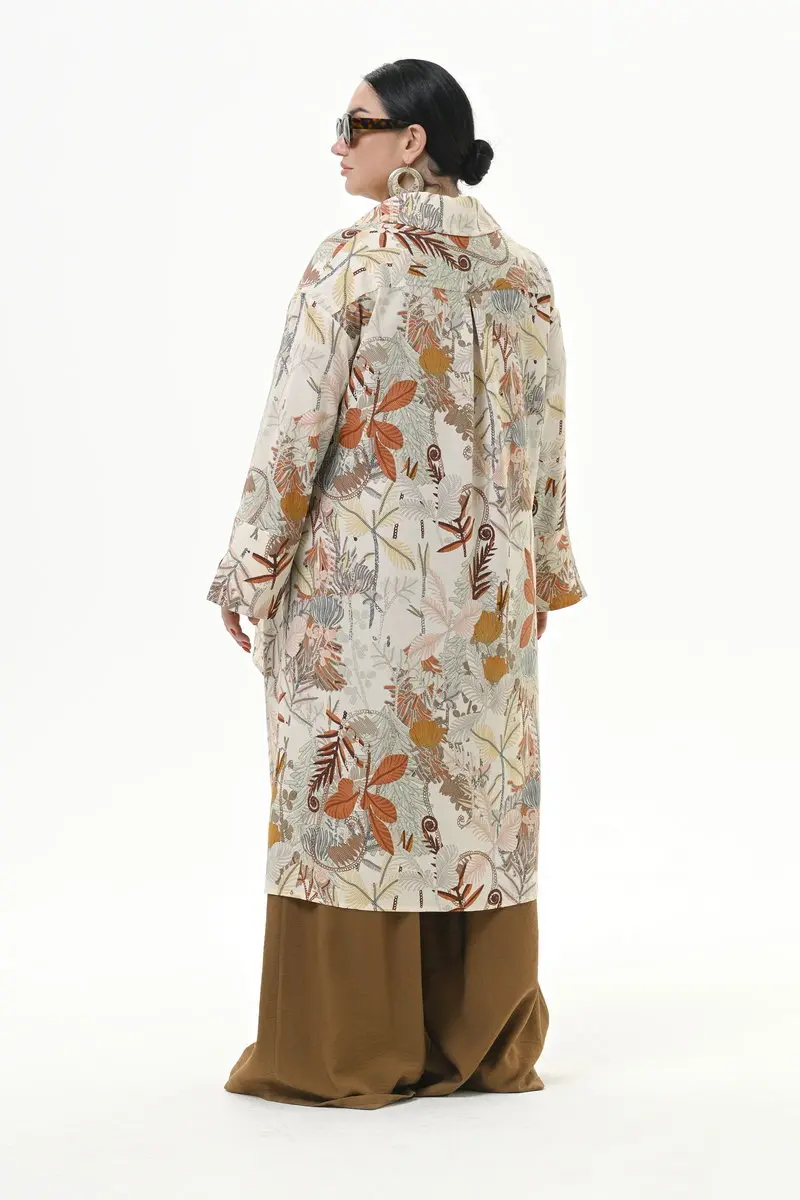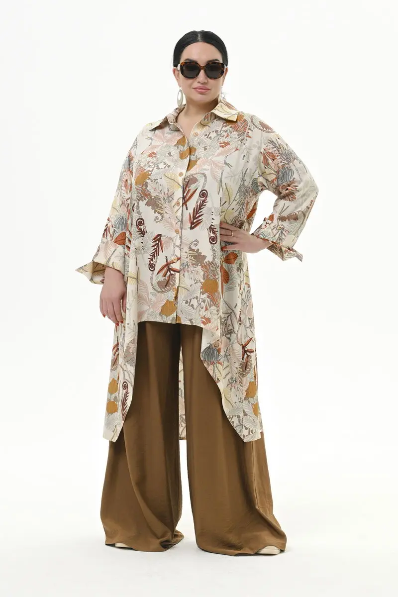 Стильная длинная рубашка А-силуэта из штапеля с фигурной формой линии низа.