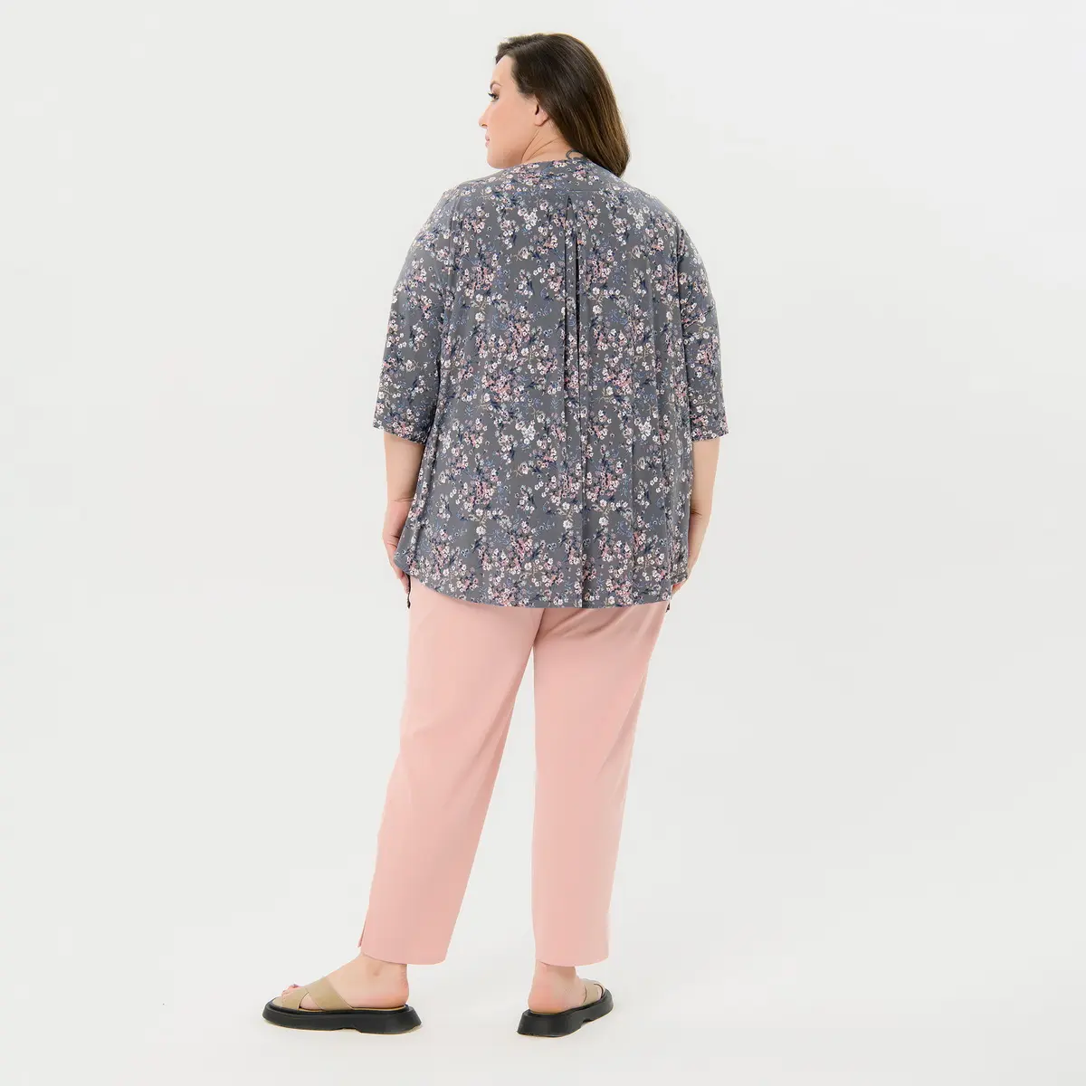 Свободная туника из трикотажа "масло". Горловина на закругленной кокетке. По центру переда из под кокетки сборочка, по центру спинки встречная складка. Линия плеча спущена, рукав прямой, расширенный.