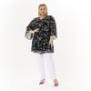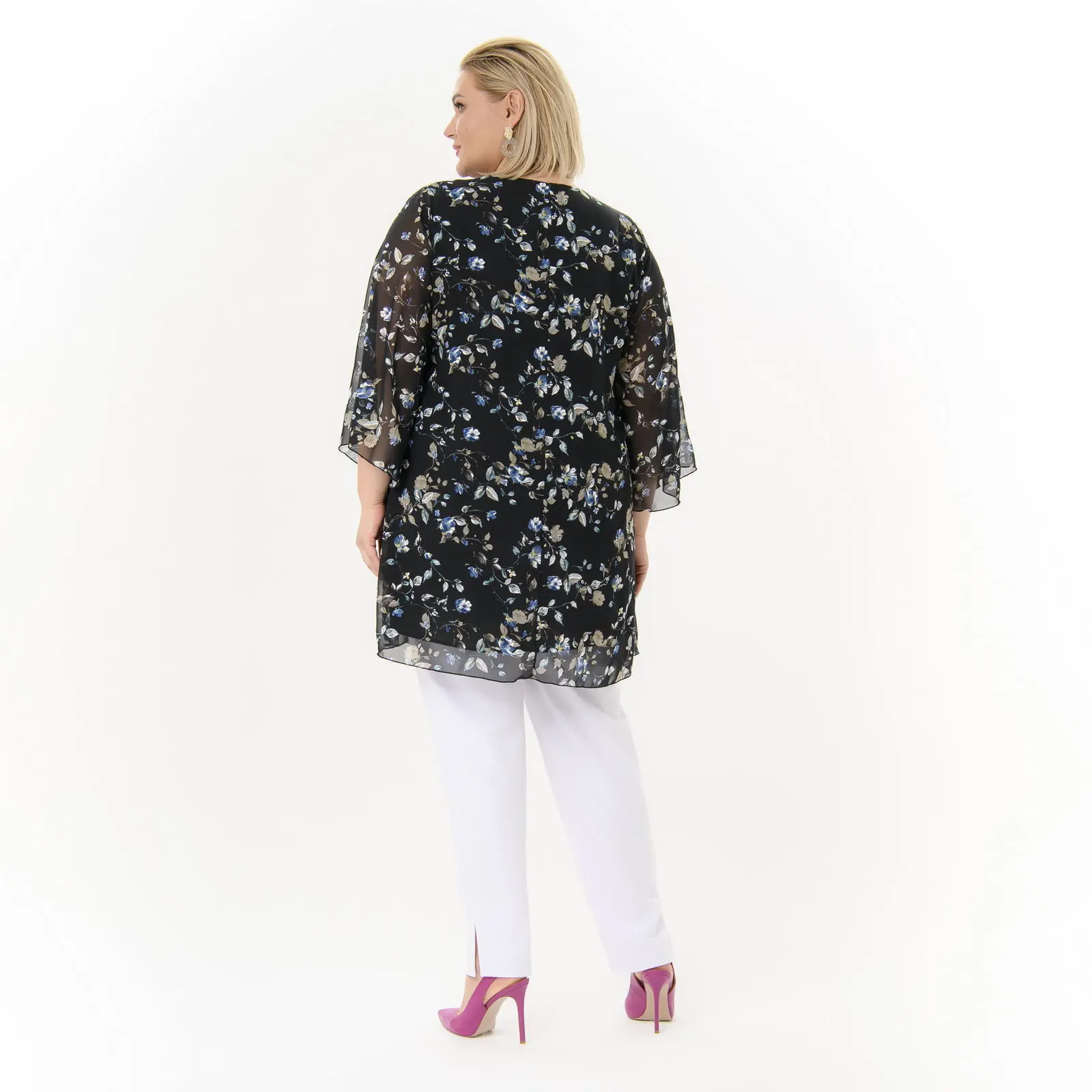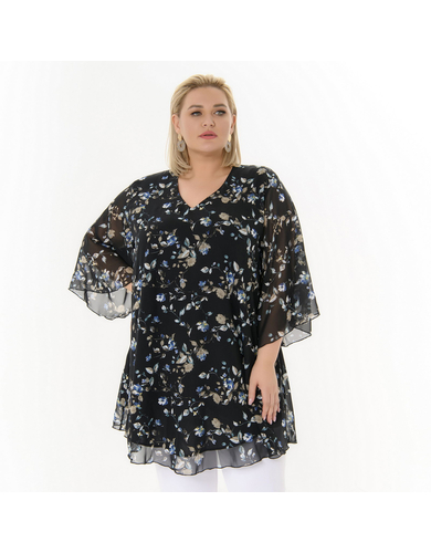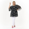 > Туника свободная, шифон черный, принт "бирюзовые цветы"