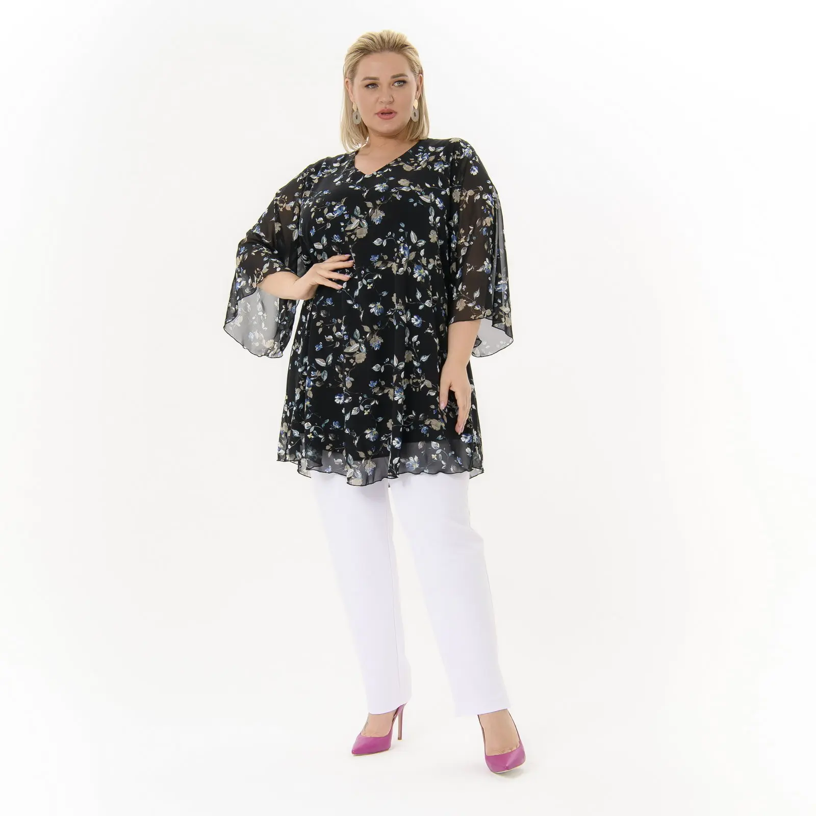 Туника свободного силуэта из шифона. V-вырез горловины. Рукав расклешенный, линия плеча спущена. Идеально сочетается с зауженными брючками.