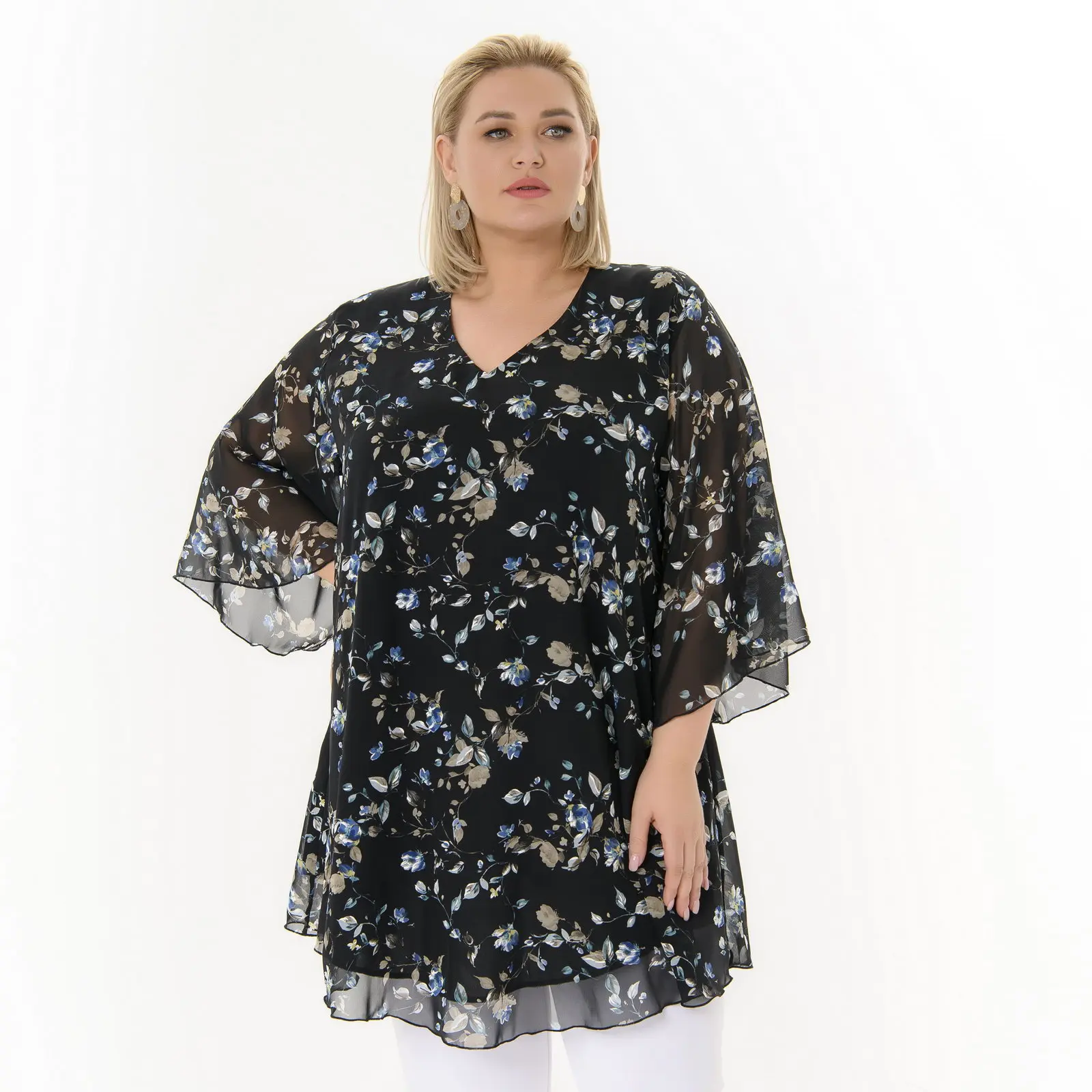 Туника свободная, шифон черный, принт "бирюзовые цветы"