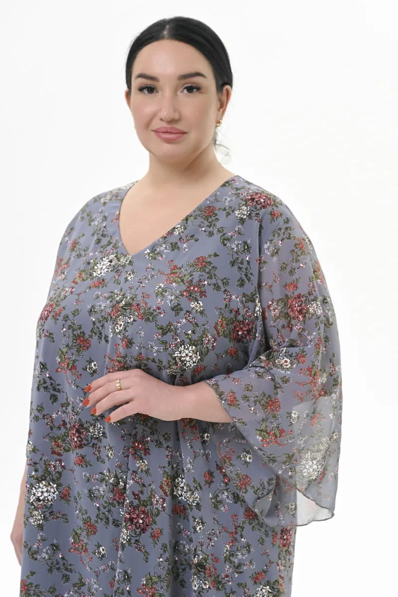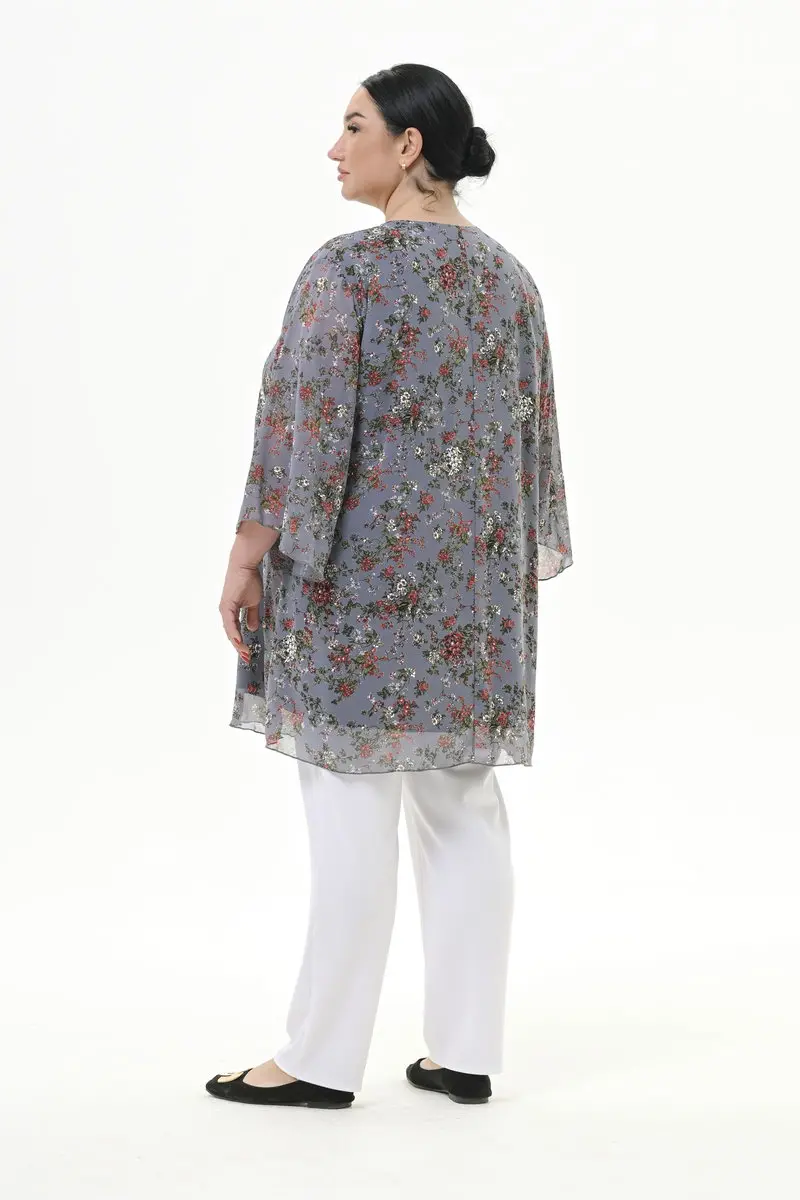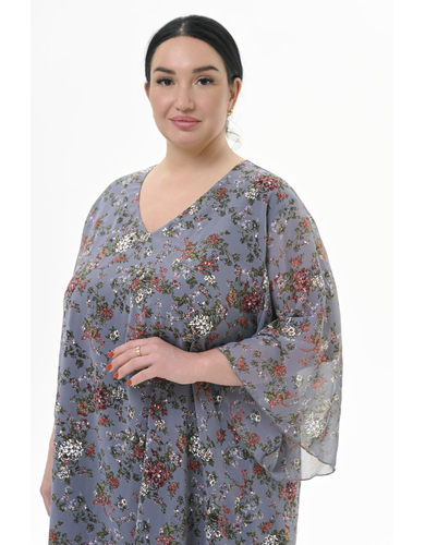 > Туника свободная, шифон, принт цветочный, фон графитовый