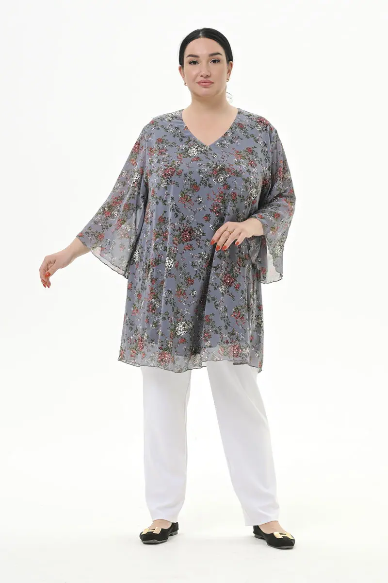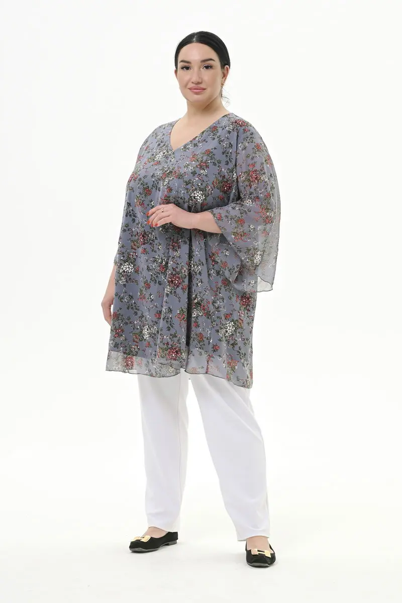 Туника свободного силуэта из шифона. V-вырез горловины. Рукав расклешенный, линия плеча спущена. Сочетается с любыми брюками и джинсами.