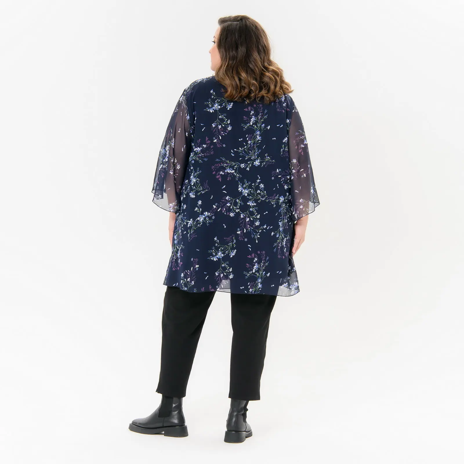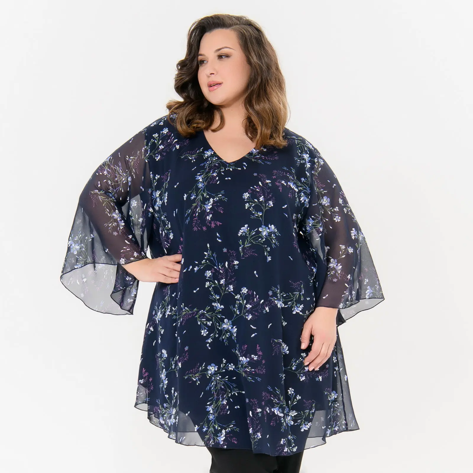 Туника свободного силуэта из шифона. V-вырез горловины. Рукав расклешенный, линия плеча спущена. Идеально сочетается с зауженными брючками.