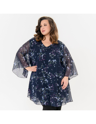 > Туника свободная, шифон темно-синий, принт "синие цветы"