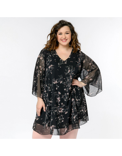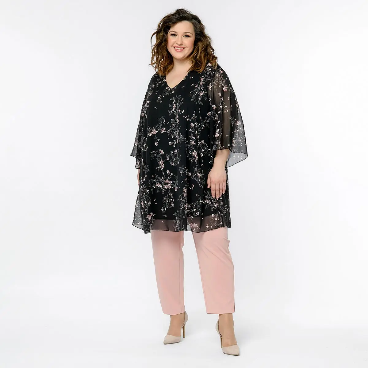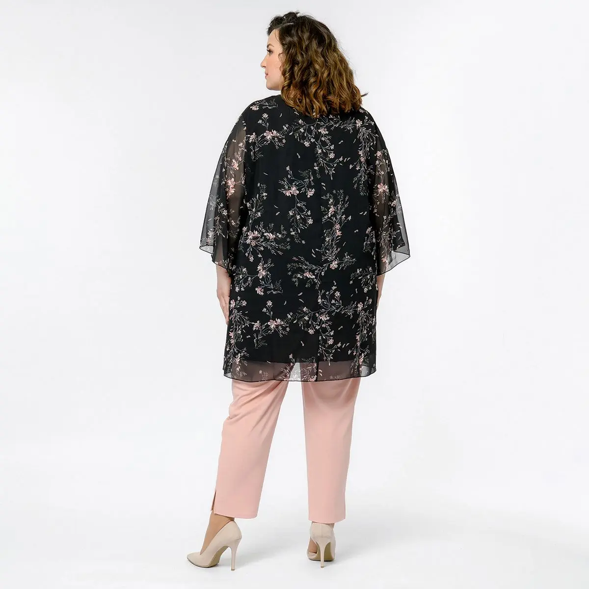 > Туника свободная, шифон черный, принт "пудровые цветы"