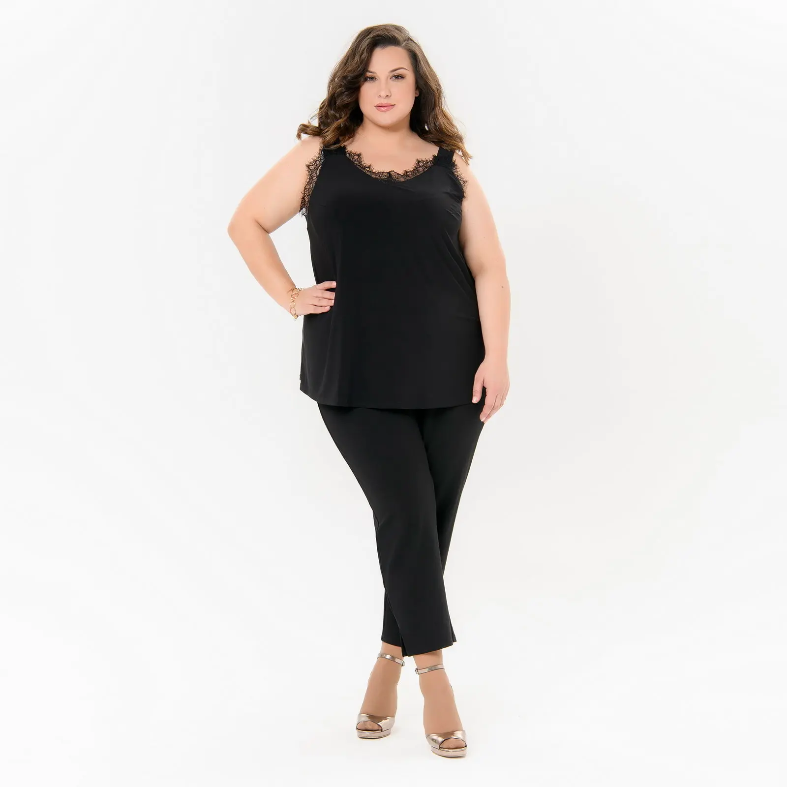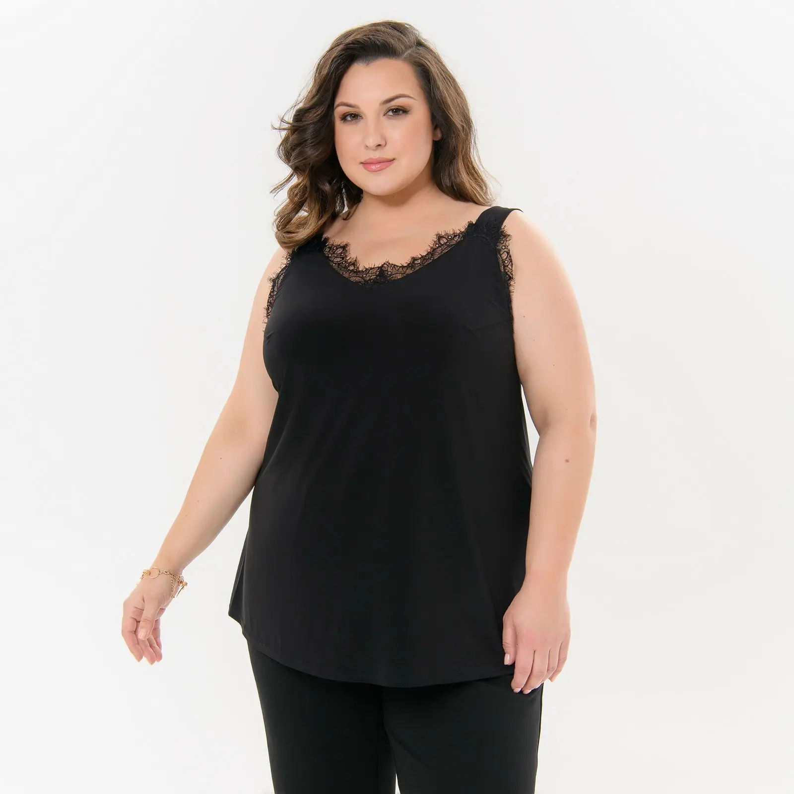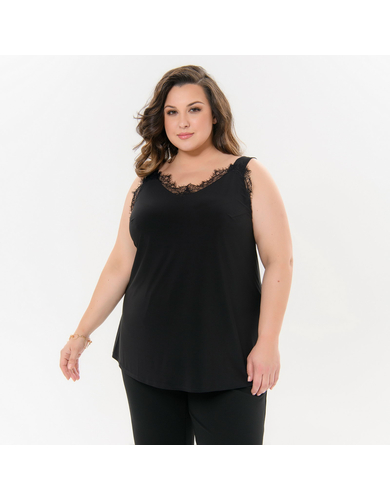 Топ из струящегося трикотажа "масло" на бретелях. Фигурный вырез полочки украшает нежное черное кружево "реснички".