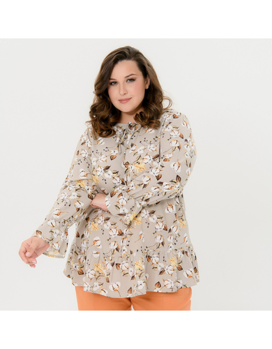 Свободная туника из штапеля. Вырез горловины округлый, по центру переда фиксируется завязочками из основной ткани. Рукав широкий, со сборочкой по окату, позволяет скрыть любую полноту рук. Рукав заканчивается оборочкой из основной ткани. В шов притачивания оборки к рукаву вставлена резиночка, с ее помощью можно регулировать длину рукава.