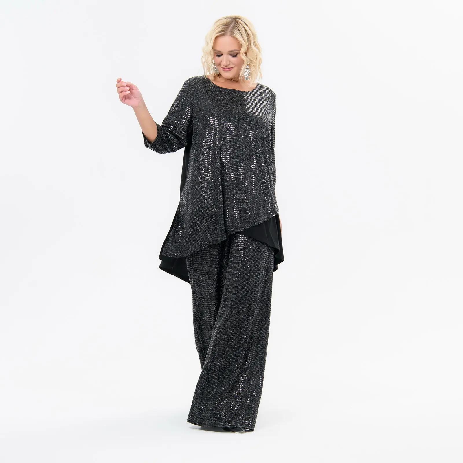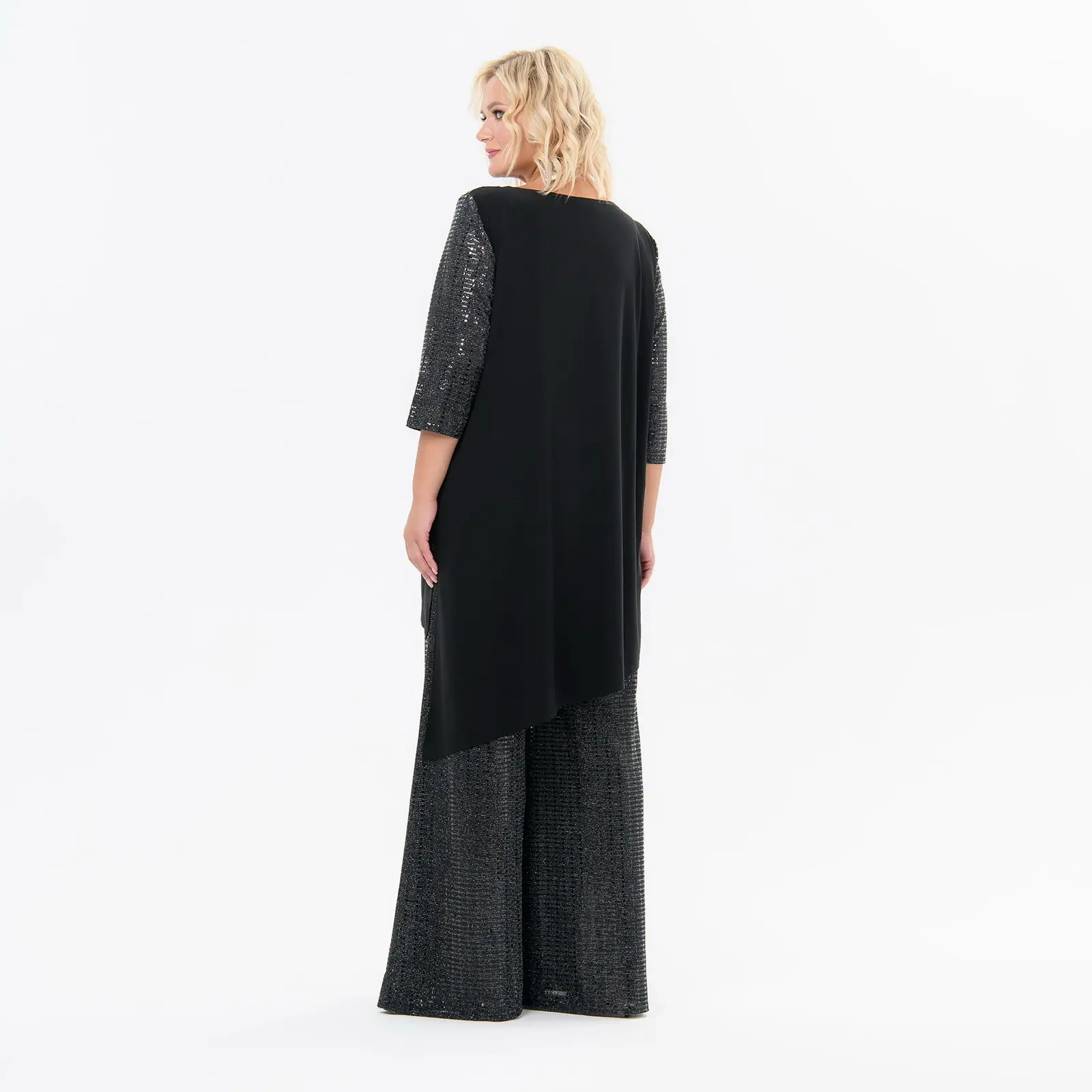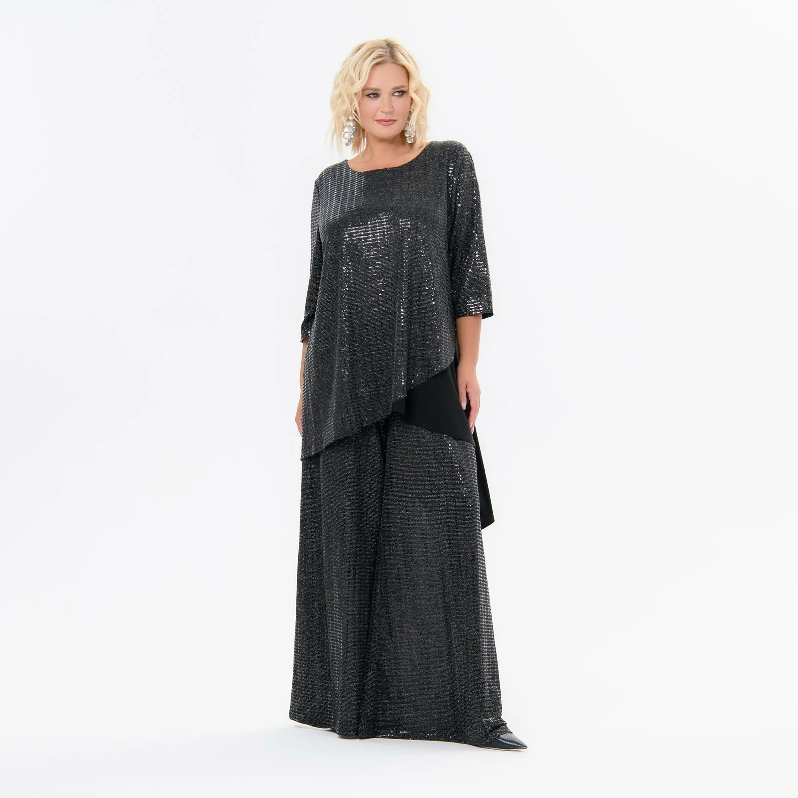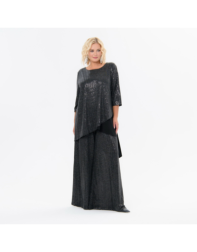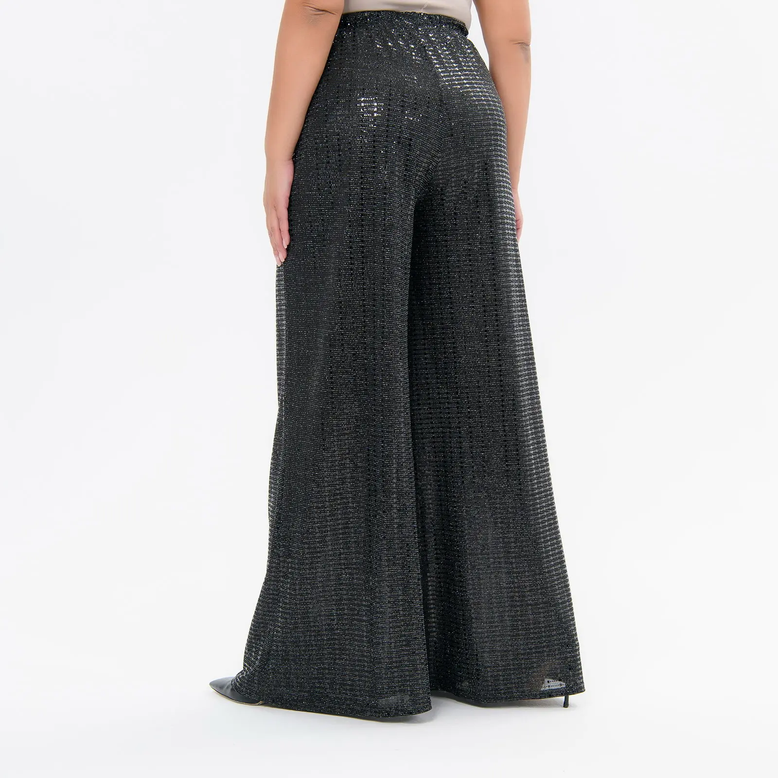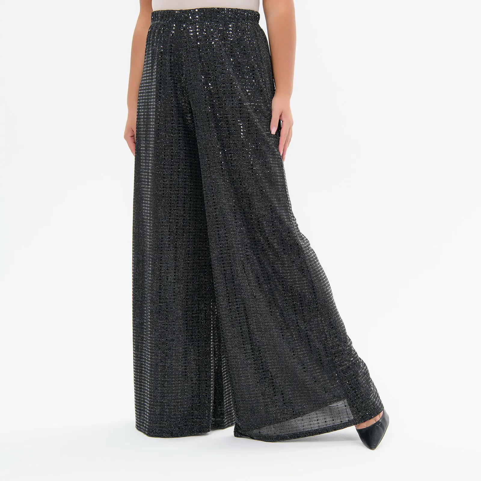 Расклешенные брюки из струящейся ткани с блеском. Верх на резинке шириной 3,5 см.